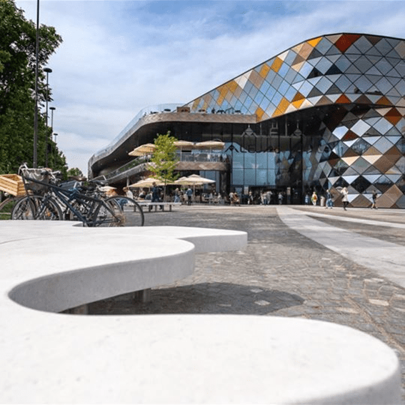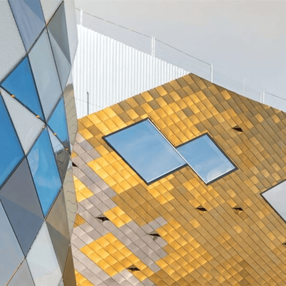 外装デザインの大きな魅力は何といってもステンドグラスを思わせる色彩豊かな幾何学模様のファサードです。建築ガラス製造におけるヨーロッパの最大手の1社であるTvitec社によって製造されました。今回同社は、特にファサードや鉄筋鉄骨を用いた建築の分野で世界でも有数の建築設計会社であるイタリアのPichler Projects社が手動するプロジェクトに参画し、重要な役割を果たしました。 Tvitec社は、Tecglass社のデジタル印刷技術を活用し、今回の革新的なショッピングおよびレクリエーションセンターのために、4,000㎡近くのガラスの加工を担当しました。このプロジェクトのためにTvitec社によって加工された膨大な製品群の中で、特筆すべき製品は、デジタル印刷技術を駆使した装飾ガラスです。最高の断熱性や居住性最を提供するのは勿論、洗練されたデザインへのニーズに応えられるように設計されました。複層ガラス、強化ガラス、合わせガラスを提供しており、一部にはUVカットフィルムも組み込まれています。透明度60%のパールホワイトカラーを使用して製作されたこれらの特別なデザインガラスでは、複数のガラスを比較しても色味などの外見に差異が出ない様工夫されています。印象的な幾何学模様ファサードには、高断熱性と安全性を実現するため、多くのアルゴンガス入り複層ガラス、強化合わせガラスが使用されています。