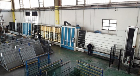PALUMBO GLASS社の生産サイクルは、ジャンボサイズ(6,000×3,300 mm)が保管されている自動倉庫から始まります。自動倉庫には、単板用と合わせ用の3つの切断ラインが接続され、午前6時から午後10時まで2シフトで稼働します。切断されたガラスは、複層ガラス用の1号ライン(標準サイズの住宅用複層ガラスの製造用・2シフト制)または2号ライン(異形ガラス用、ジョージアン窓用、最大4,000×2,500 mmの複層ガラス用)に送られます。各ラインには品質管理システムが設置されています。