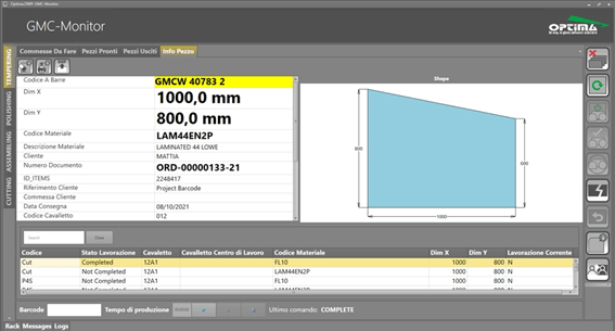 GMC-MONITORは、タッチモニター上で動作するように設計され、固定式または無線式のバーコードリーダーや、ガラスの通過を検出するように構成されたセンサーと統合して動作することができ、インダストリー4.0の要件で機械と完全に連動することができます。OPTIMA社と機械メーカーの連携により、GMC-MONITORが、加工されるガラスのリストを機械に受け渡し、機械から加工完了の情報を受け取るという双方向の通信が可能な工場が増えつつあります。(TERMINUS機能)。