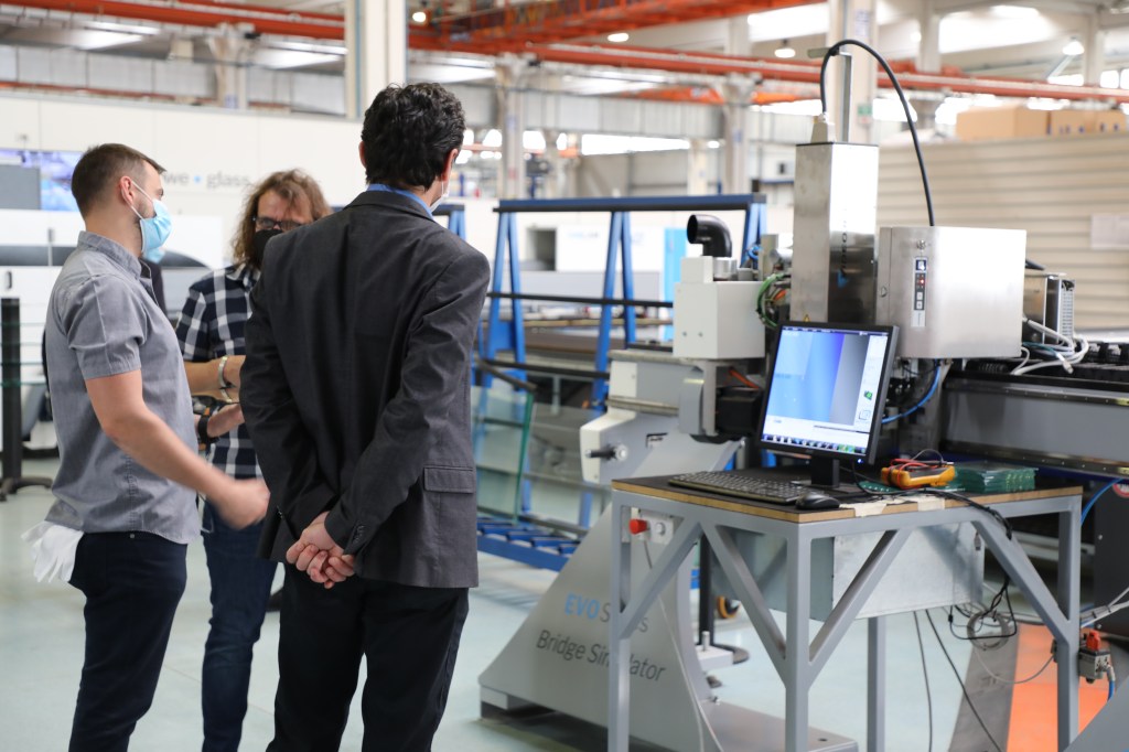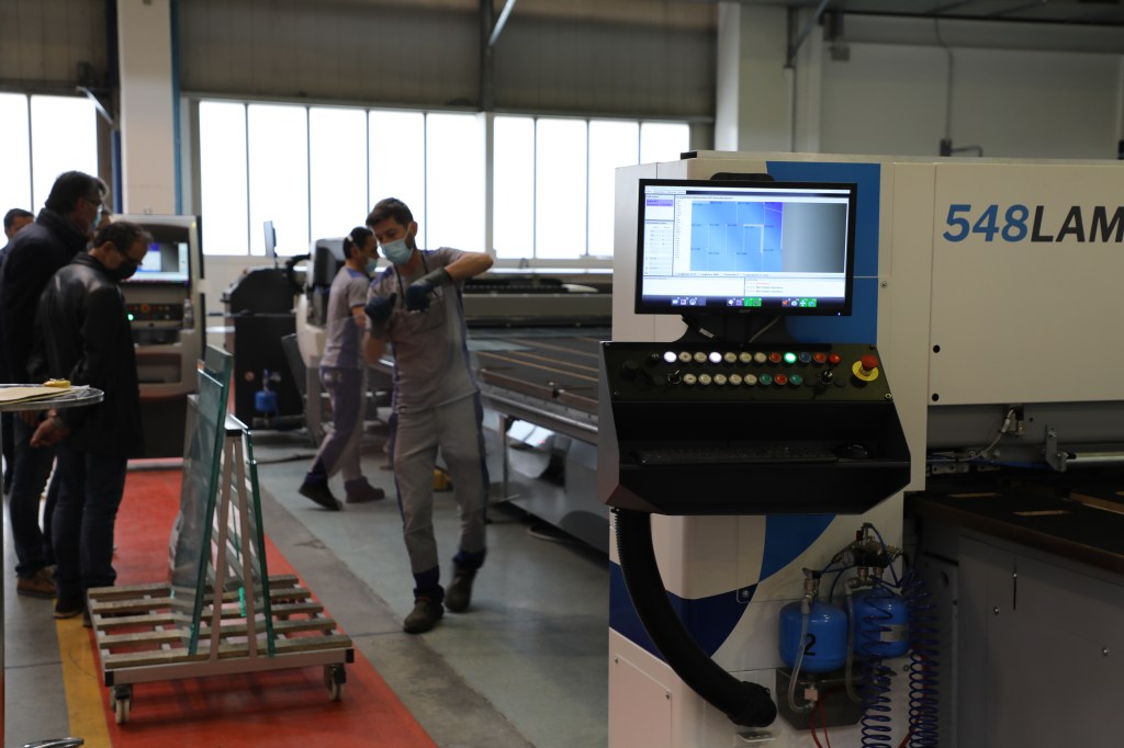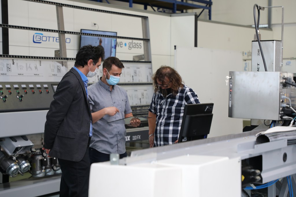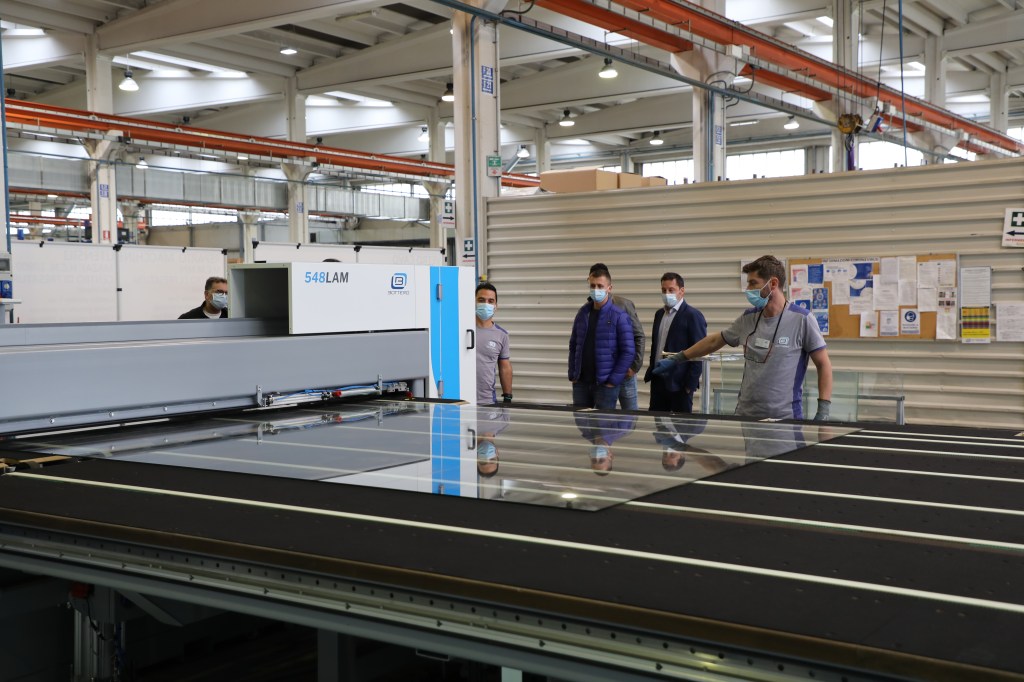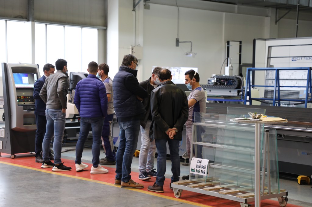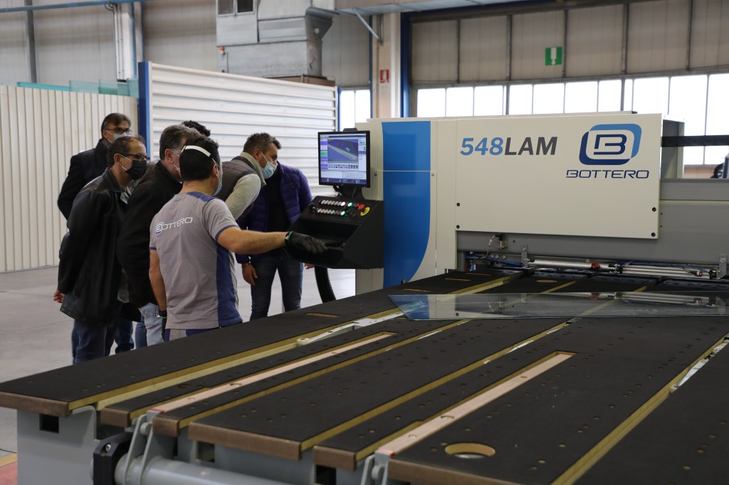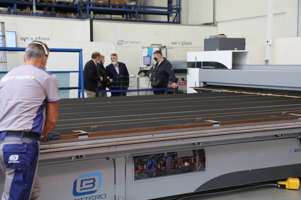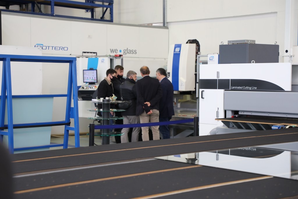 100名以上の来場者が、市場でのベストセラーである合わせガラス切断機(型式:548LAM)と、様々な種類のコーティング(Low-E / TPF / Easy Pro 等)に対応する高性能なコーティング除去機能を搭載した単板切断機(型式:363BCS)とのデュアルラインのコンパクト版を視察・体験しました。