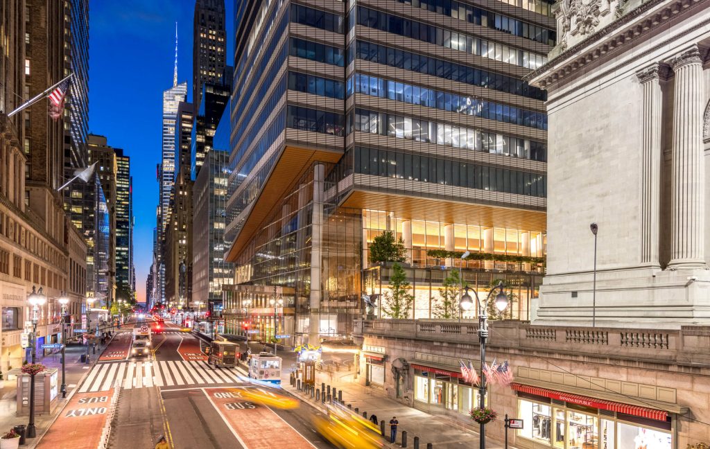 外装に使用されたテラコッタ材は、隣接するグランドセントラル駅に使用されているものと同種が採用されており、Permasteelisa社により設計された全面複層ガラスと優れたコンビネーションを発揮しています。グランドセントラル駅と同ビルはコンコースで直結されおり、伝統的なグランドセントラル駅と同種の材質を採用することで、一体感を表現しています。