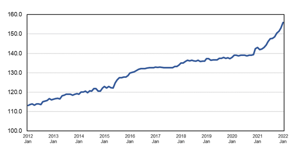 2022年1月15日に米国労働統計局が発表した生産者物価指数(品目別情報)の速報値によれば、1月度の板ガラスの生産者物価指数は155.902であり、先月比+3.7(+1.9%)、前年同月比で+12.9(+9.0%)となりました。