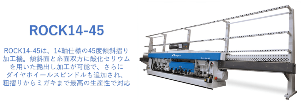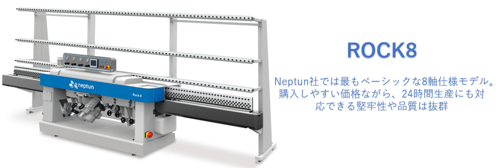 Neptun社は、縦型コバ磨き機で世界的に有名なBavelloni(バベロニ)社のBavelloni家が2008年に創業。Bavelloni社の伝統的な設計思想を踏襲しており、設備の性能と耐久性は世界的に高い評価を得ています。伝統をただ踏襲するだけでなく、RockにはNeptun社独自の複数の特許技術が採用されており、伝統と最新技術を融合させた設備となっています。
