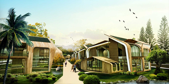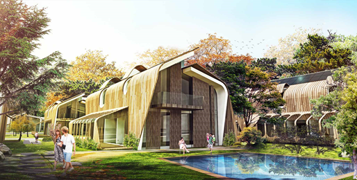 前述の通り、本プロジェクトでは大自然との融合と共生が大きなテーマとして定められています。また、窓ガラスだけの工夫に留まらず、自然換気のメカニズムも設計に取り入れられています。ヴィラの全てのオープンスペースは自然風が効率良く通過できるように配置されており、サマーリゾート地でありながら、清涼な環境に身を置くことが可能です。大自然との融合を掲げている本施設では当然電力消費量を低減することも考慮されており、屋上に設置された太陽光パネルにより発電も行われます。