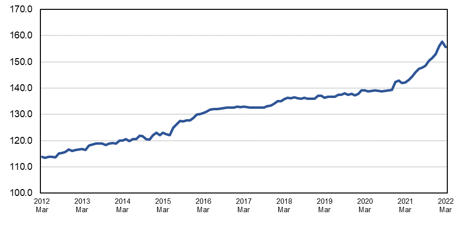 2022年4月13日に米国労働統計局が発表した生産者物価指数(品目別情報)の速報値によれば、3月度の板ガラスの生産者物価指数は155.707であり、先月比-2.1(-1.3%)、前年同月比で+13.5(+9.5%)となりました。