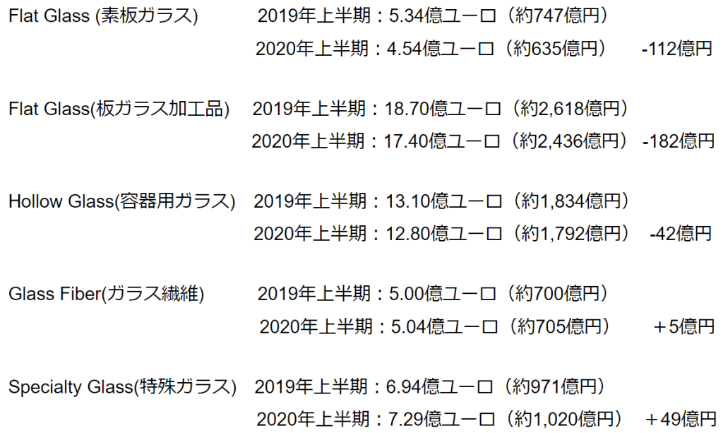 参考指標1のグラフはドイツにおけるガラス業界各分野の2019年上半期、及び2020年上半期の売上を比較しています。あくまで一つの参考指標となりますが、情報を纏めると下記の様になります。