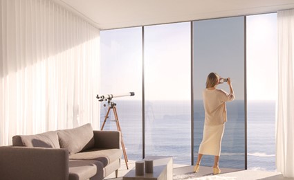 これにより、わずか1秒で、eyrises350ソーラーコントロールガラスは遮熱フィルムを貼ったようなダークな色合いへと変化し、景観は保ったまま、日光と日射熱から即座に室内を保護します。 日光の強弱が時間の経過とともにする場合は、光の透過率を無段階調整し、窓の色合いを調整できます。 これにより、空調と照明の費用が持続的に削減されます。