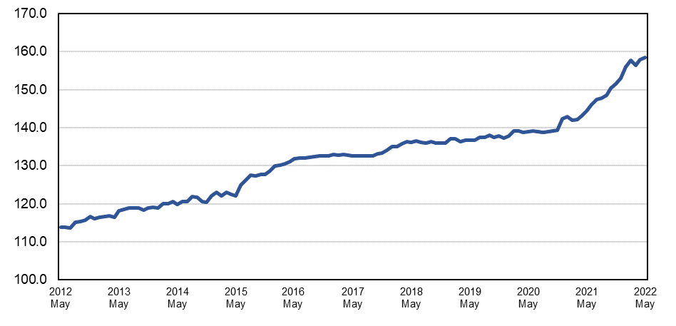 2022年6月14日に米国労働統計局が発表した生産者物価指数(品目別情報)の速報値によれば、5月度の板ガラスの生産者物価指数は158.546であり、先月比+0.67(+0.4%)、前年同月比で+4.1(+9.8%)となりました。