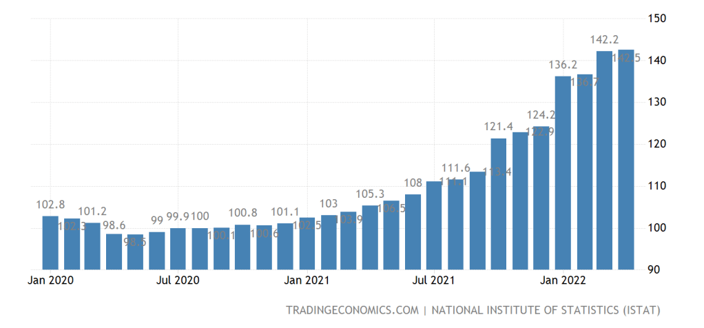 イタリアの国立統計研究所が同国内の生産者物価指数を公開しています。新型コロナウイルス感染症の流行が本格化する前の2020年1月度の生産者物価指数は102.8でしたが、その後上昇を続けており、同研究所が公開している直近のデータである2022年4月の同指数は142.5と、約38.6%の上昇となっています。