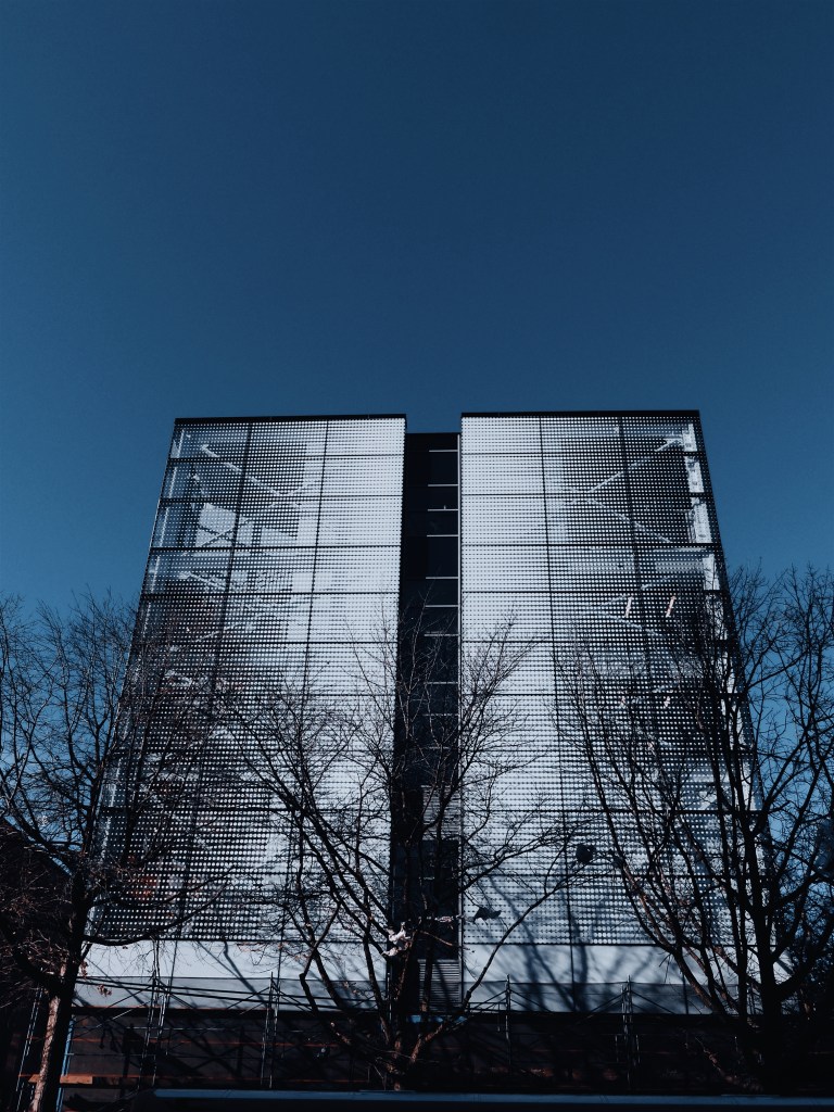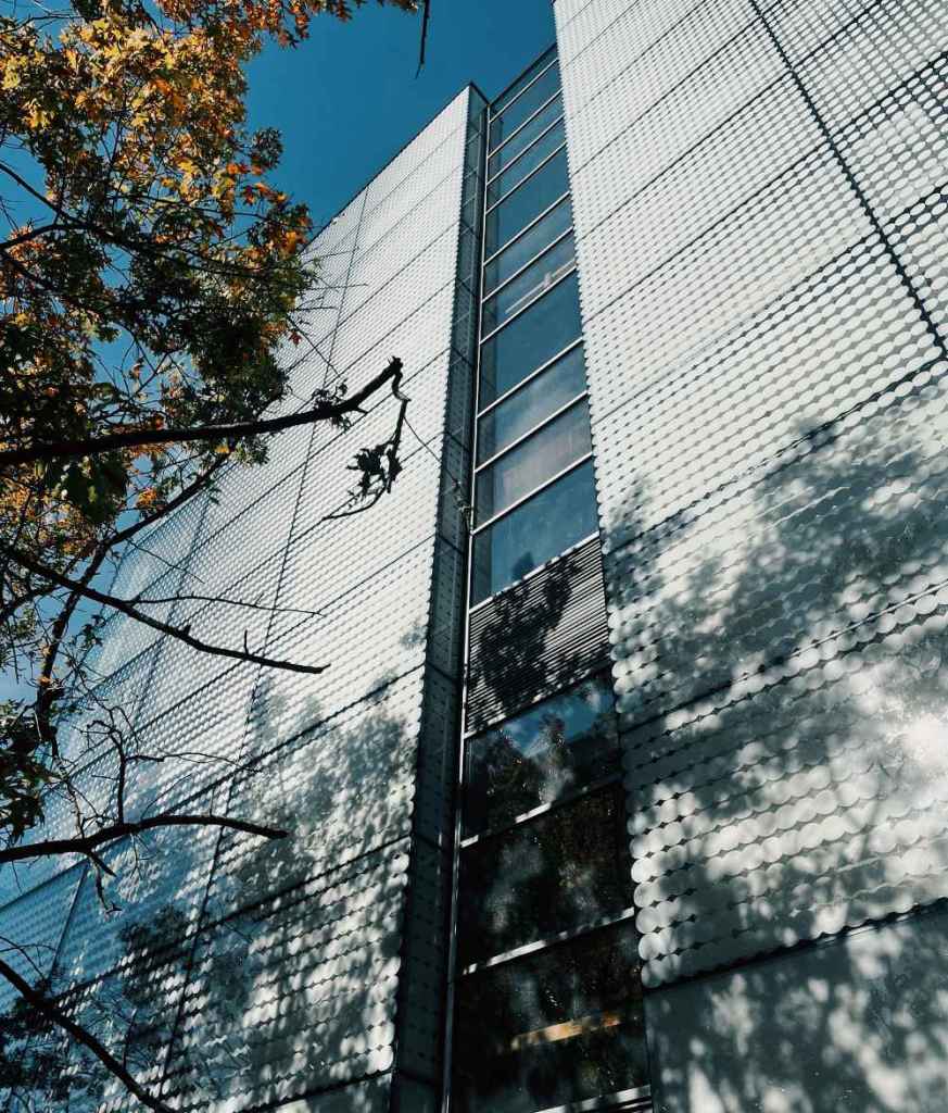 この物件のファサードでは白いドット柄がさまざまな大きさで正確に印刷されており、無限の広がりを演出した、ユニークで魅力的、かつ機能的なビル用ガラスファサード作品に仕上がっています。