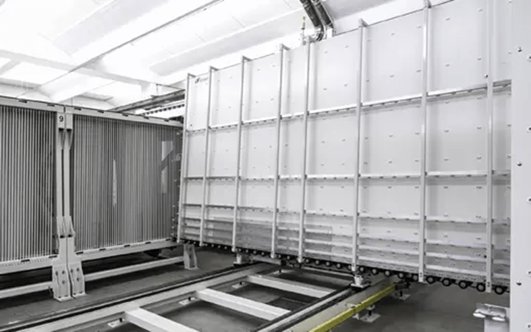 この複層ガラス製造ラインでは、Forel社製Art.SSソーティングシステムから自動的にガラスが投入されます。Art.SSソーティングシステムは、生産工程における板ガラス管理のためのガラスの在庫・保管システムであり、生産管理ソフトウェアとプログラミングによってガラスの入出を自動化することが可能です。Glasstecで初めて展示されて以来、このソーティングシステムは、ボトルネック工程やシーケンス・制御エラーが改善され、生産性、工程管理、安全、品質といった点が向上し明確な優位性を備えた製品となっています。