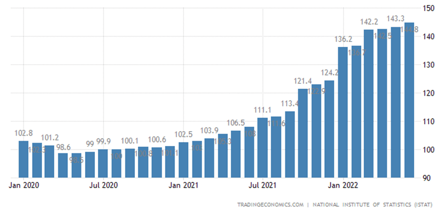 イタリアの国立統計研究所が同国内の生産者物価指数を公開しています。新型コロナウイルス感染症の流行が本格化する前の2020年1月度の生産者物価指数は102.8でしたが、その後上昇を続けており、同研究所が公開している直近のデータである2022年7月の同指数は144.8と、約40.9%の上昇となっています。