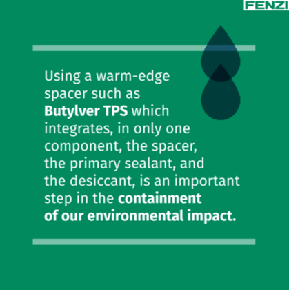 ‐BUTYLVER TPSのようなウォームエッジスペーサーを使用することは、スペーサーや1次シール、乾燥剤が不要となり、構成要素部品が1つに集約されるため、環境不可が比較的低くなります。