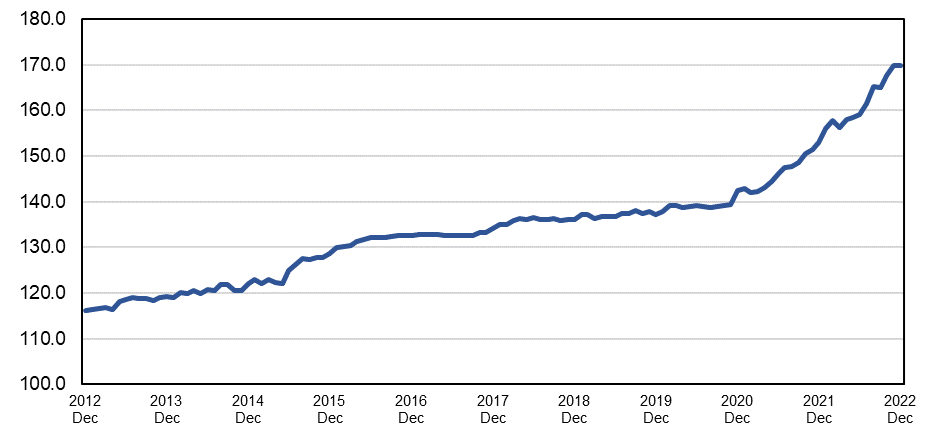 2023年1月18日に米国労働統計局が発表した生産者物価指数(品目別情報)の速報値によれば、12月度の板ガラスの生産者物価指数は169.761であり、先月比+0.0(+0.0%)、前年同月比で+16.8(+11.0%)となりました。