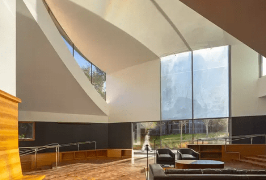 建物のフォルムは、周囲の風景に溶け込み、建物と中庭の風景とが美しく映し出されています。それは自然と芸術とを調和させるものでもあります。ルーベンシュタインコモンズには、キャンパス内部団体や研究生活をサポートするさまざまなミーティングスペースがあります。今後は同所の歴史や貢献を紹介する写真や資料の展示スペースとしても活躍する予定です。