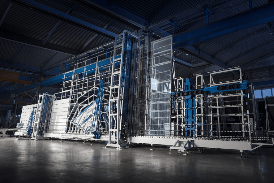 合わせガラス切断ラインは、仕掛ガラス保管システムも利用可能です。これは、切断仕掛中のガラスを保管するためのもので、新しい切断をする際に再度取り出すことができます。これはすべて全自動で実施できます。