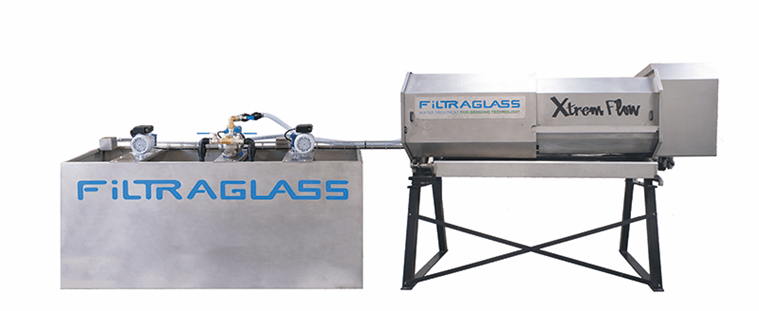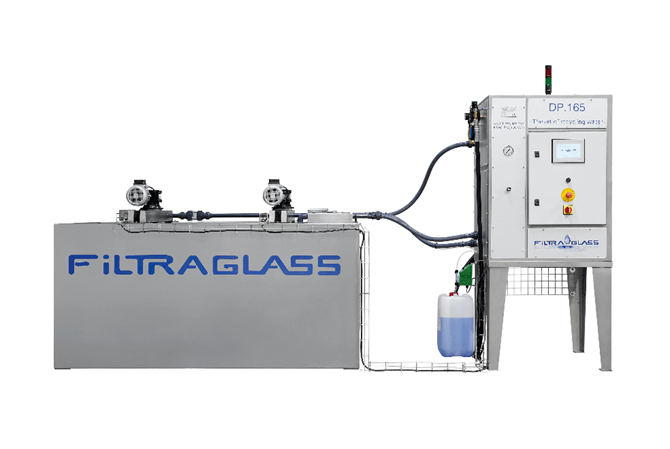 FILTRAGLASS社では、あらゆる種類のガラス産業向けの水濾過システムを製造しており、光学産業や自動車産業、板ガラスの加工分野全般を幅広くカバーしています。同社のシステムは、主にガラス加工プロセスで使用される水に含まれるガラスの粒子(スラッジ)を濾過して抽出するもので、再利用可能な水が得られるとともに、乾燥した固形廃棄物として排出します。