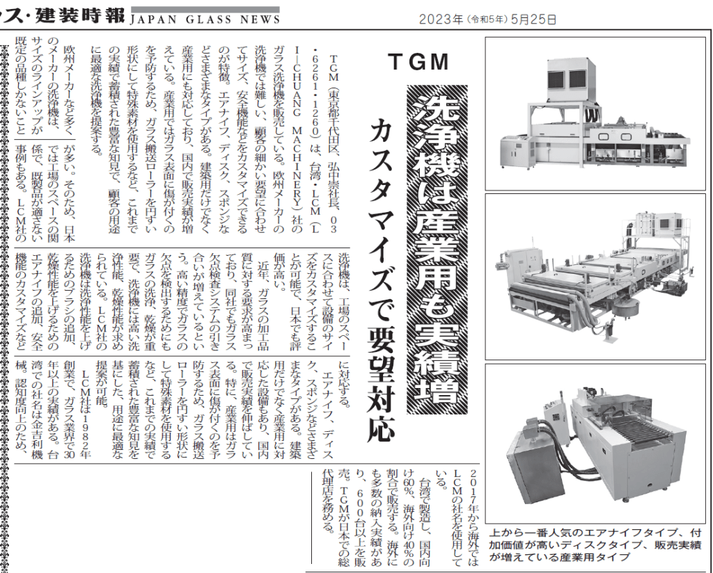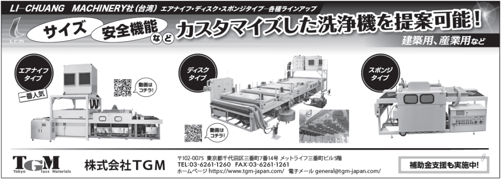 TGM(東京都千代田区、弘中崇社長、03・6261・1260)は、台湾・LCM(LI―CHUANG MACHINERY)社のガラス洗浄機を販売している。欧州メーカーの洗浄機では難しい、顧客の細かい要望に合わせてサイズ、安全機能などのカスタマイズができるのが特徴。エアナイフ、ディスク、スポンジなどさまざまなタイプがある。建築用だけでなく産業用にも対応しており、国内で販売実績が増えている。産業用ではガラス表面に傷が付くのを予防するため、ガラス搬送ローラーを円すい形状にして特殊素材を使用するなど、これまでの実績で蓄積された豊富な知見で、顧客の用途に最適な洗浄機を提案する。