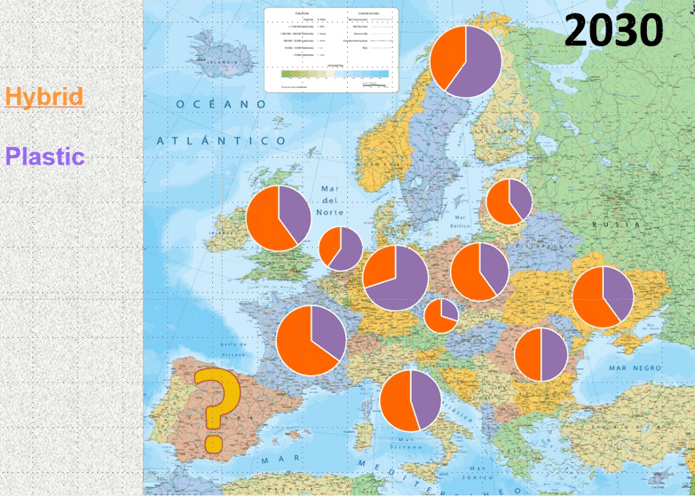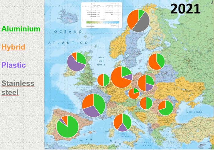 更に時代が進むと、ハイブリッドタイプよりも更に熱伝導率を低くするために樹脂スペーサーの需要が伸び始めます。窓の断熱性能の規制が厳しい英国では積極的に採用が進み、2021年でのシェアは10年で大きく様変わりしています。(ただし、スペインでは法規制により未だにアルミスペーサーが主流となっています。)