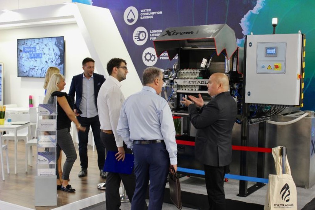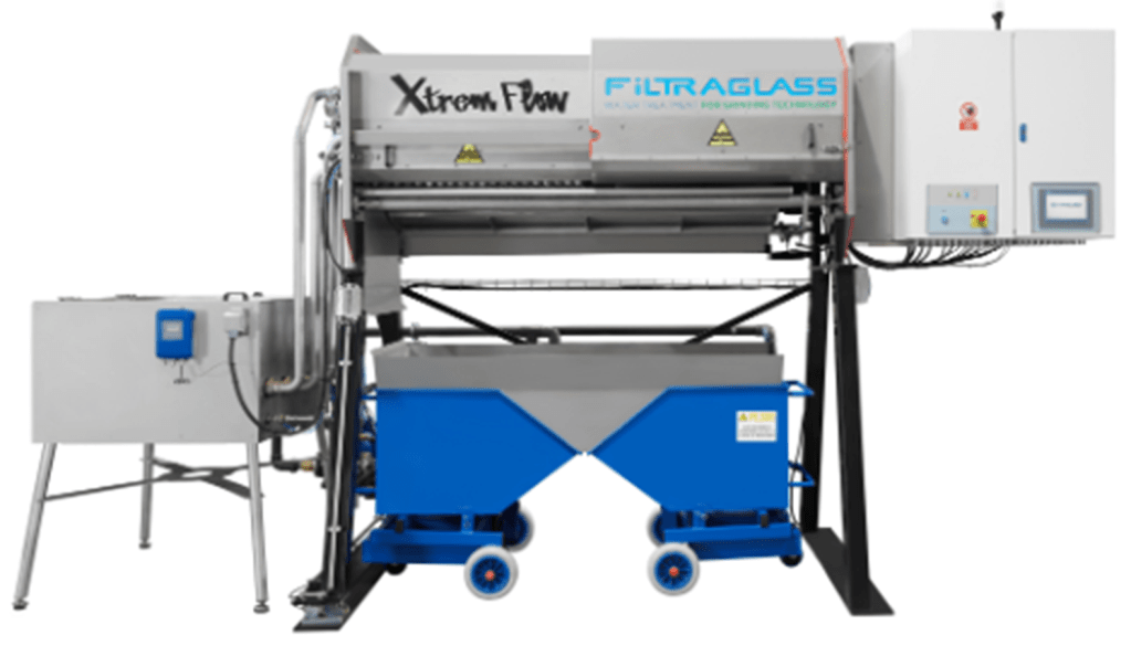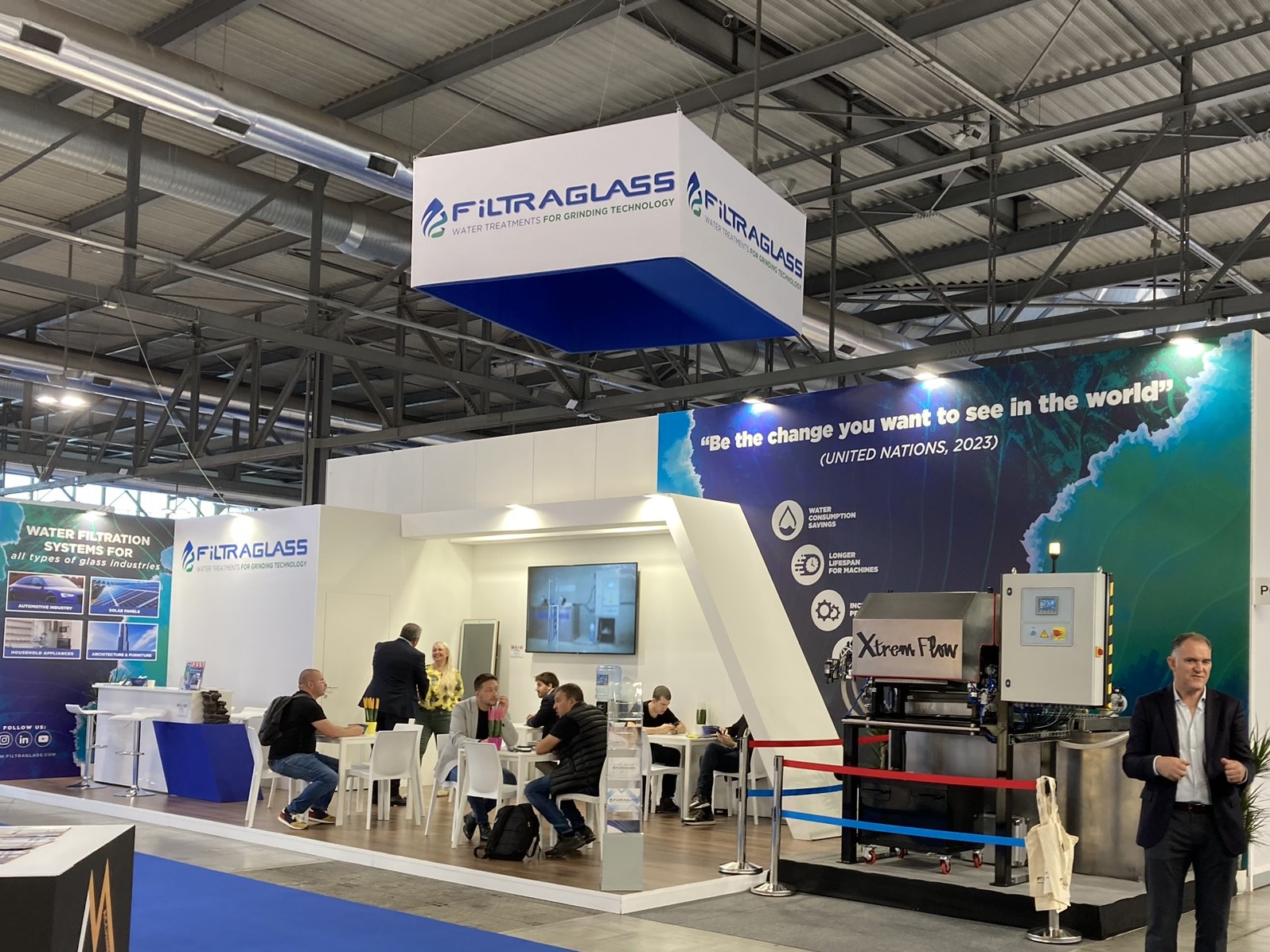 スペイン・FILTRAGLASS社ではあらゆる種類のガラス産業向けの水処理システムを製造しており、板ガラス加工のみならず光学産業や自動車産業向けなど幅広く利用されています。同社のシステムは、主にガラス加工プロセスで使用される水に含まれるガラスの粒子(スラッジ)を濾過して抽出するもので、再利用可能な水が得られるとともに、スラッジを乾燥した固形廃棄物として排出します。フィルターで濾過処理された水はCNC加工機のスピンドルにも再利用が能です。