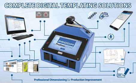PRODIM社は、オランダと米国に拠点を置くガラス・石材等の寸法測定器・システムを扱うメーカーです。同社の代表的な製品は、自社開発で特許技術でもある「Proliner(プロライナー)」です。Prolinerは、トラッキングデバイスと三次元測定機(CMM)の中間に位置するポータブルデジタル測定器です。持ち運びが容易であり、施工現場・現物で寸法データを測定し、即デジタル化することが可能です。測定値は、生産、管理、設計のためのCAD図面として出力することができます。今回のVITRUM2023でもProlinerの実演が行われました。