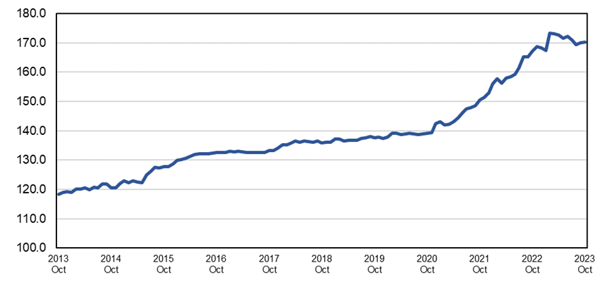 2023年11月15日に米国労働統計局が発表した生産者物価指数(品目別情報)の速報値によれば、10月度の板ガラスの生産者物価指数は170.280であり、先月比+0.24(+0.14%)、前年同月比で+3.17(+1.90%)となりました。