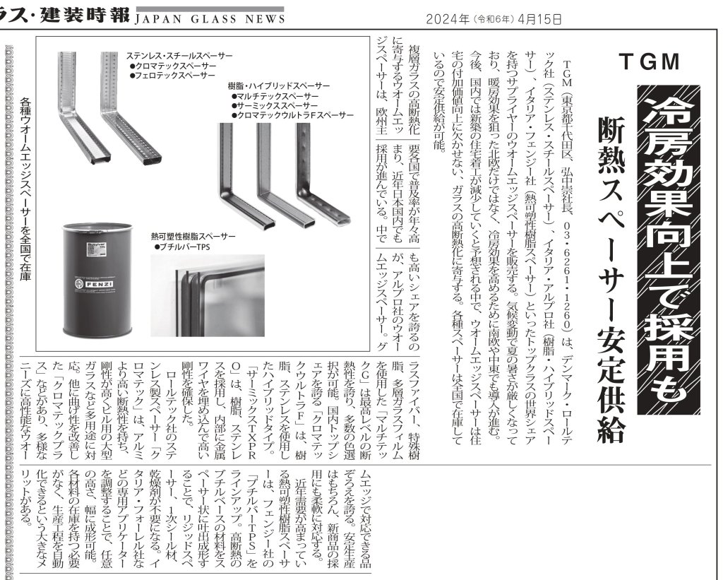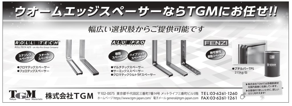 TGM(東京都千代田区、弘中崇社長、03・6261・1260)は、デンマーク・ロールテック社(ステンレス・スチールスペーサー)、イタリア・アルプロ社(樹脂・ハイブリッドスペーサー)、イタリア・フェンジー社(熱可塑性樹脂スペーサー)といったトップクラスの世界シェアを持つサプライヤーのウオームエッジスペーサーを販売している。気候変動で夏の暑さが厳しくなっており、暖房効果を狙った北欧だけではなく、冷房効果を高めるために南欧や中東でも導入が進む。今後、国内では新築の住宅着工が減少していくと予想される中で、ウオームエッジスペーサーは住宅の付加価値向上に欠かせない、ガラスの高断熱化に寄与する。各種スペーサーは全国で在庫しているので安定供給が可能。