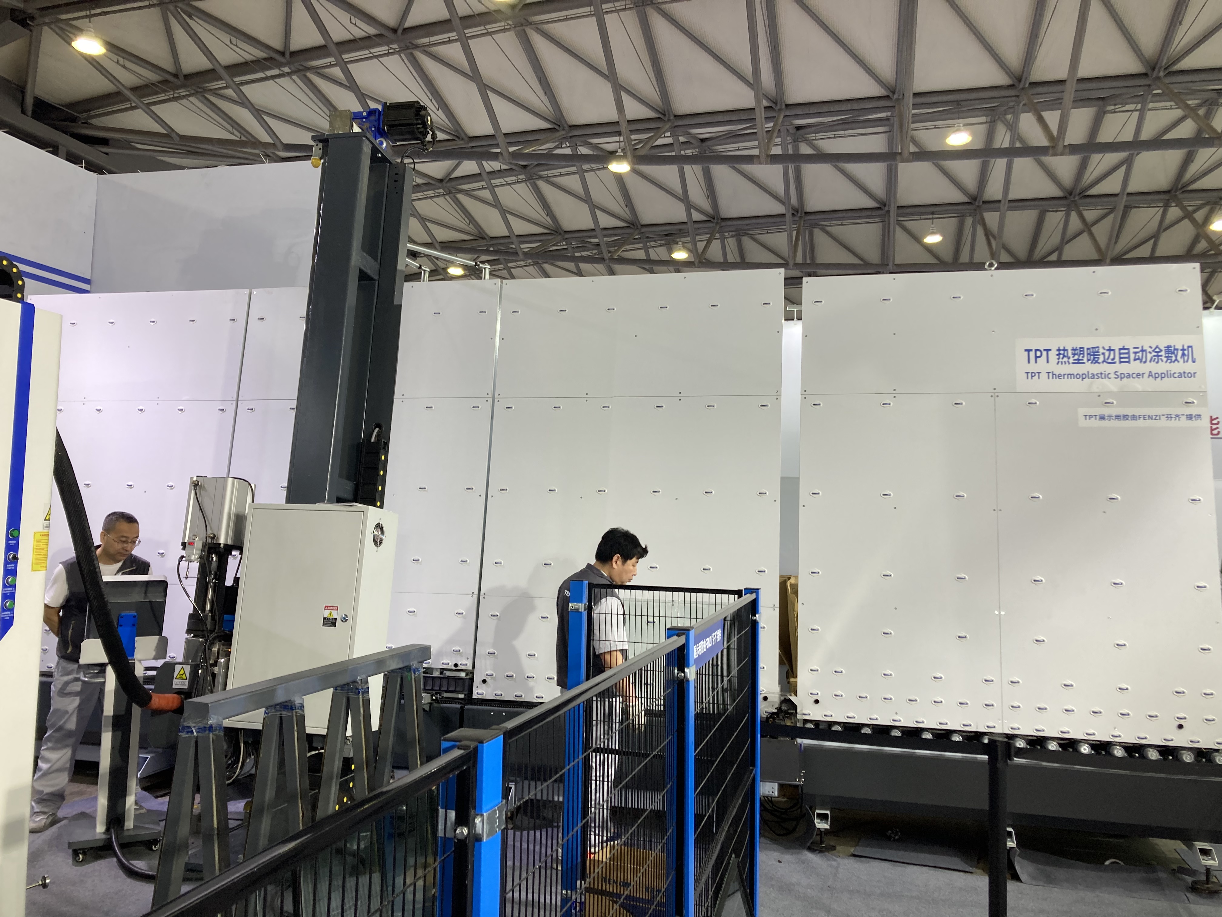 N5ホールでは加工設備の中でも特に複層ガラス製造設備メーカーが出展しています。昨年度は数社のみしか展示していなかった「熱可塑性樹脂スペーサー塗布装置(アプリケーター)」ですが、今年度は少なくとも5社以上が展示をしている点が驚きでした。各社実用面には未だ課題があるとしながらも、中国メーカーの新技術の展開の速さには目を見張るものがあります。