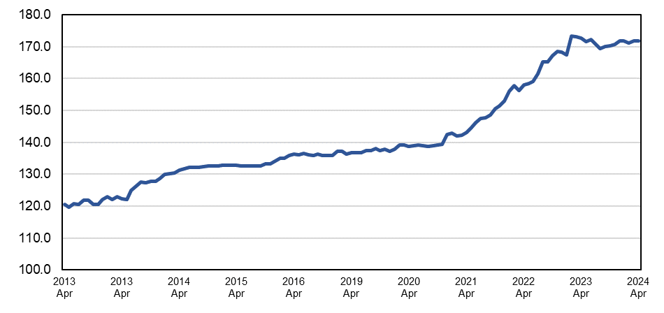 2024年5月14日に米国労働統計局が発表した生産者物価指数(品目別情報)の速報値によれば、2024年2月度の板ガラスの生産者物価指数は171.818であり、先月比+0.00(+0.00%)、前年同月比で-0.799(-0.46%)となりました。