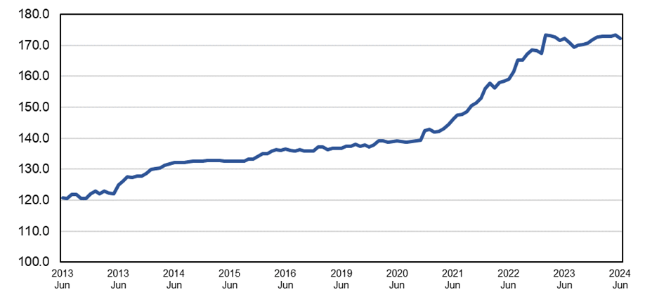 過去10年の板ガラスの生産者物価指数の推移を下図に示します。昨年2月につけた173.319のピークから落ち着いていた物価指数ですが、2024年5月に173.241(速報値)として再び過去最高値に迫りました。6月に入り再び落ち着きを見せておりますが、依然として物価指数は高止まりのままとなっています。米国における生産者物価指数の全品目の平均値は0.2%増加(財は先月比0.5%減、サービスは0.6%増)となっており、全体としてはやや上昇基調となっている模様です。引き続き動向を注視して参ります。