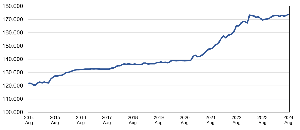 2024年9月12日に米国労働統計局が発表した生産者物価指数(品目別情報)の速報値によれば、2024年8月度の板ガラスの生産者物価指数は173.643であり、先月比+0.494(+0.285%)、前年同月比で+4.143(+2.444%)となりました。
