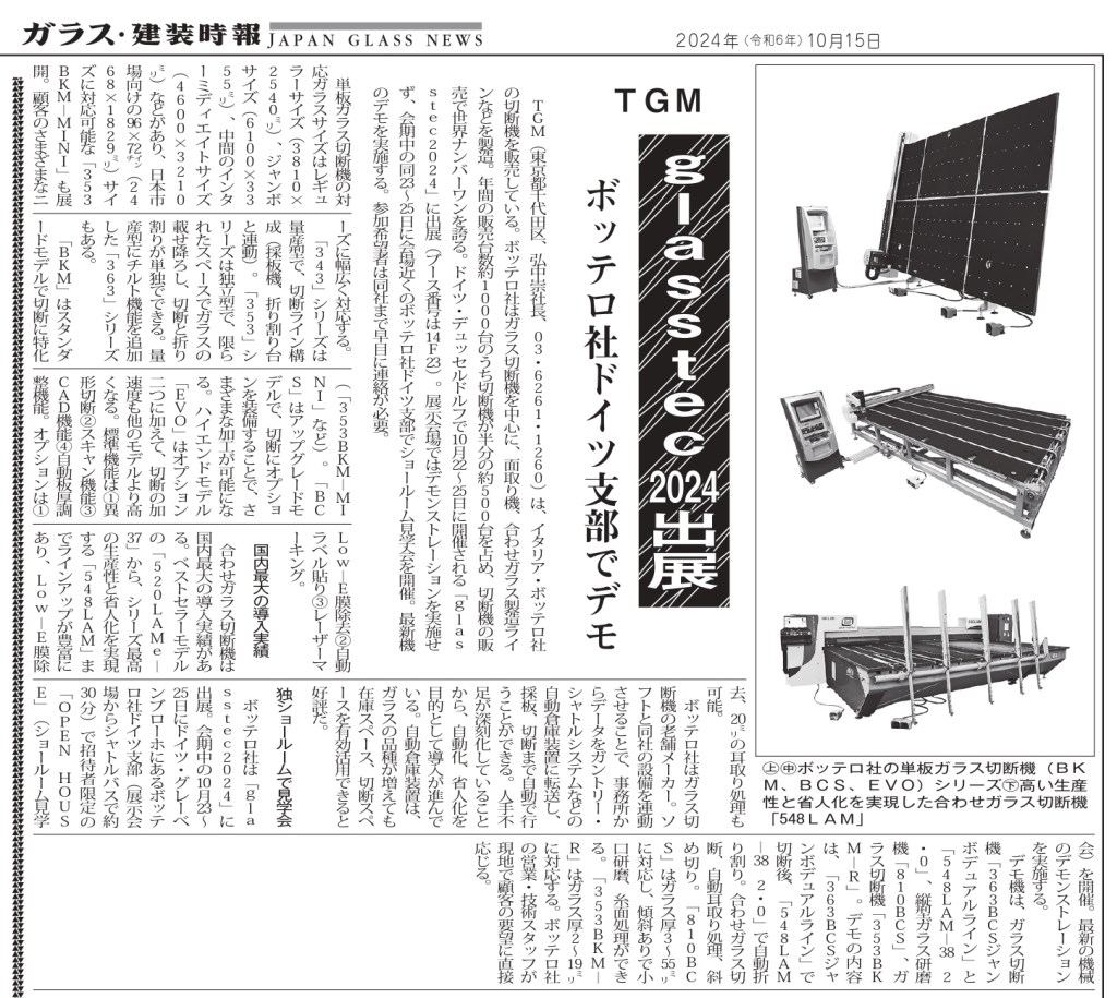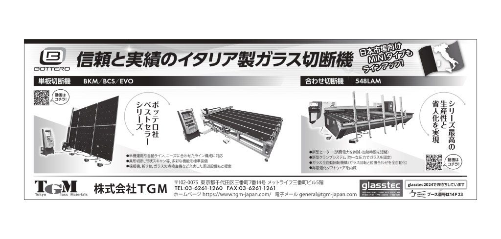 TGM(東京都千代田区、弘中崇社長、03・6261・1260)は、イタリア・ボッテロ社の切断機を販売している。ボッテロ社はガラス切断機を中心に、面取り機、合わせガラス製造ラインなどを製造。年間の販売台数約1000台のうち切断機が半分の約500台を占め、切断機の販売で世界ナンバーワンを誇る。ドイツ・デュッセルドルフで10月22~25日に開催される「glasstec2024」に出展(ブース番号は14F23)。展示会場ではデモンストレーションを実施せず、会期中の同23~25日に会場近くのボッテロ社ドイツ支部でショールーム見学会を開催。最新機のデモを実施する。参加希望者は同社まで早目に連絡が必要。