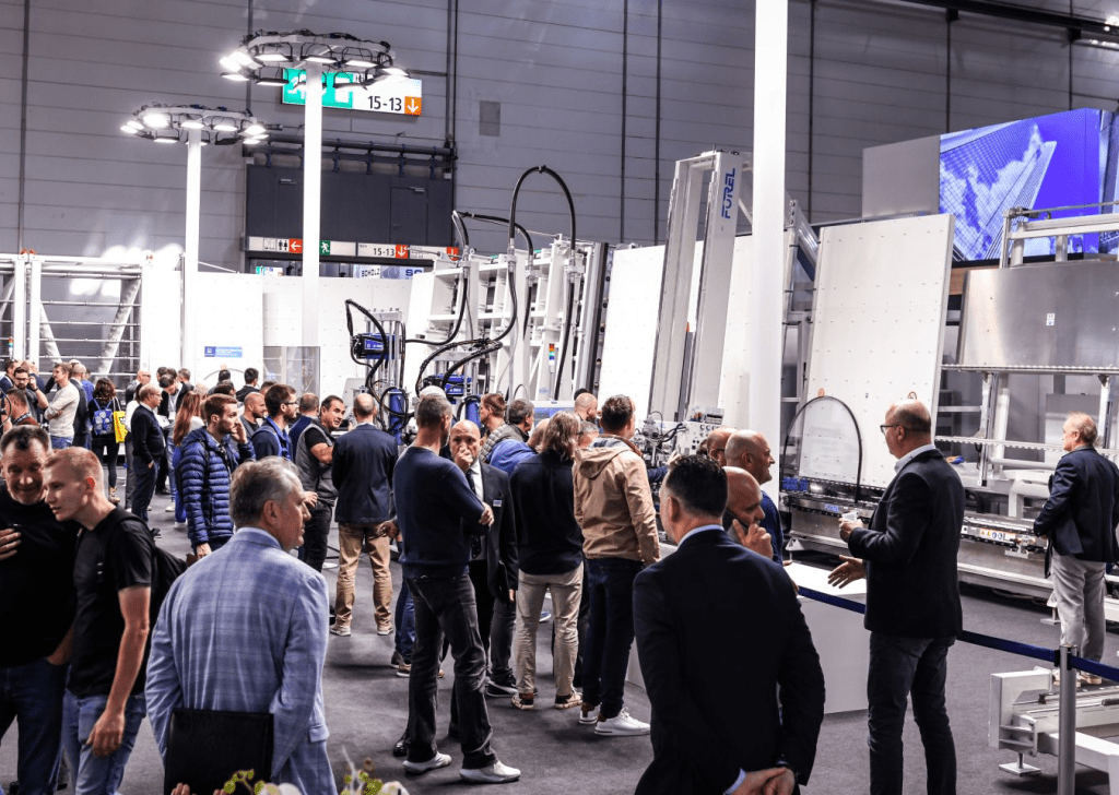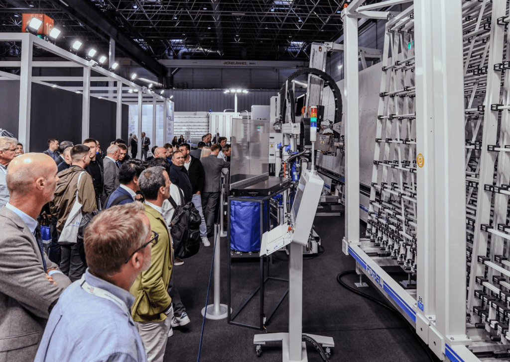 Glasstec 2024では、最先端の設備技術を実演とともに縦型エッジ加工、熱可塑性樹脂スペーサーの製造、および複層ガラス製造ラインから完成した複層ガラスユニットを直接出荷するための統合型ロジスティクスシステムをテーマとした展示となりました。