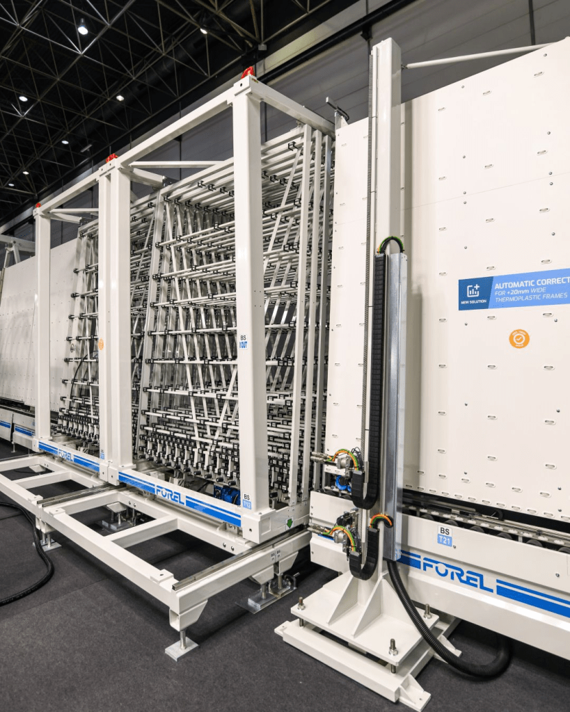 また、シーリングされた2次シールによる汚れからコンベアーと保管ラックを守るために複層ガラスの底辺にアプリケーターを自動的に装着する装置も配備されています。