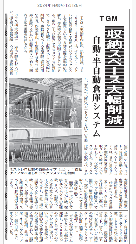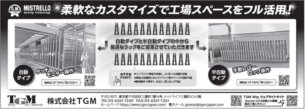 TGM(東京都千代田区、弘中崇社長、03・6261・1260)は、イタリア・ミストレロ社製の自動・半自動コンパクトラックシステムを販売している。多様な品種を効率的に在庫し、作業者の介在を最小限にすることができる。顧客ニーズに応じてカスタマイズが可能で、Aラックと比較して大幅に収納スペースを削減し、素板保管スペースを最大限に有効活用できる。作業効率化、生産性向上などガラス業界で倉庫システムへの需要は高まっており、国内での販売実績を伸ばしている。