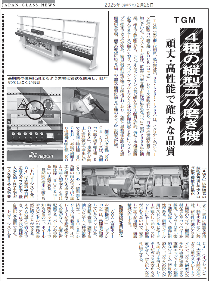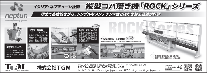 TGM(東京都千代田区、弘中崇社長、03・6261・1260)は、イタリア・ネプチューン社の縦型コバ磨き機「ROCK(ロック)」シリーズを販売しており、日本での実績が着々と増加している。ネプチューン社は、縦型コバ磨き機で世界的に有名なバベロニ家が2008年に創業。頑丈で高性能ながら、シンプルなメンテナンス性と確かな加工品質が好評。併せて水処理装置を導入するケースが増えており、スペイン・フィルトラグラス社の水処理装置とともにワンストップで提案できるのが強み。独自の特許技術が幾つも採用されており、伝統と最新技術を融合した設備運用を実現。顧客の要望に応じた加工の品質や種類に適した4種のタイプから提案が可能。