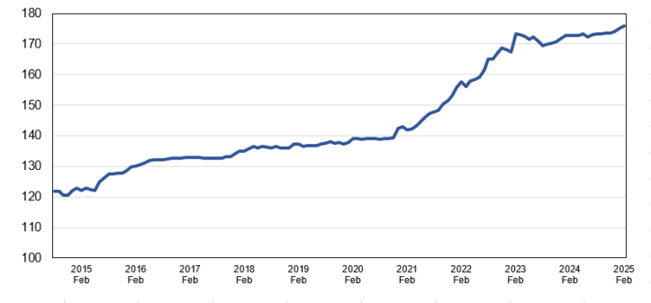 2025年3月14日に米国労働統計局が発表した生産者物価指数(品目別情報)の速報値によれば、2025年02月度の板ガラスの生産者物価指数は175.903であり、先月比+0.744(0.425%)、前年同月比で+3.002(1.736%)となりました。