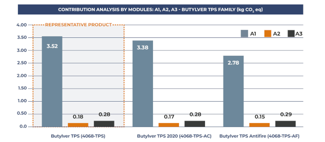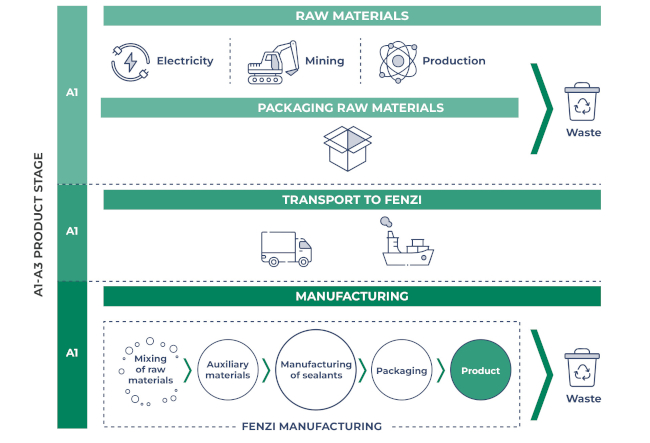 A1~A3の段階では、原材料の採取、電力生産、天然ガスの消費、廃棄物の発生、排出、包装材の使用、シーラントの生産サイクル、生産現場への材料輸送に関するデータの分析が行われました。