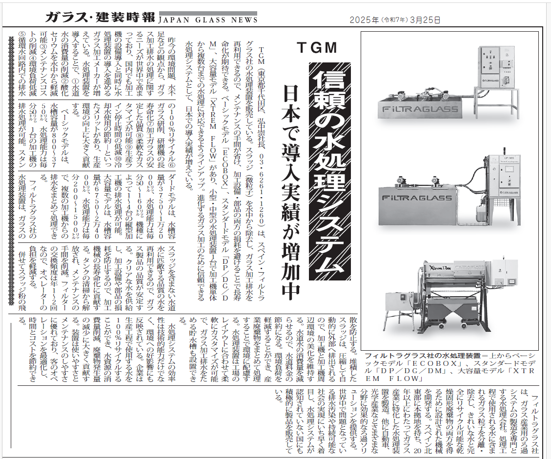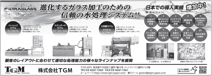 TGM(東京都千代田区、弘中崇社長、03・6261・1260)は、スペイン・フィルトラグラス社の水処理装置を販売している。スラッジ(微粒子)を水中から除去し、ガラス加工排水を再利用できるので、メンテナンスの手間が省け、加工設備・部品の両方の損耗を避けることで長寿命化が期待できる。ベーシックモデル「ECOBOX」、スタンダードモデル「DP/DG/DM」、大容量モデル「XTREM FLOW」があり、小型・中型の水処理装置1台で加工機単体から複数台までの水処理に対応できるようラインアップ。進化するガラス加工のために信頼できる水処理システムとして、日本での導入実績が増えている。
