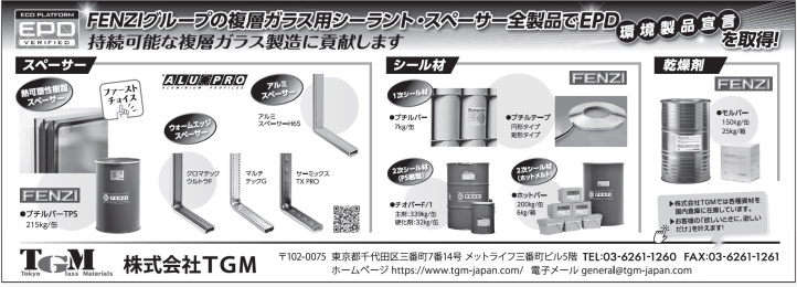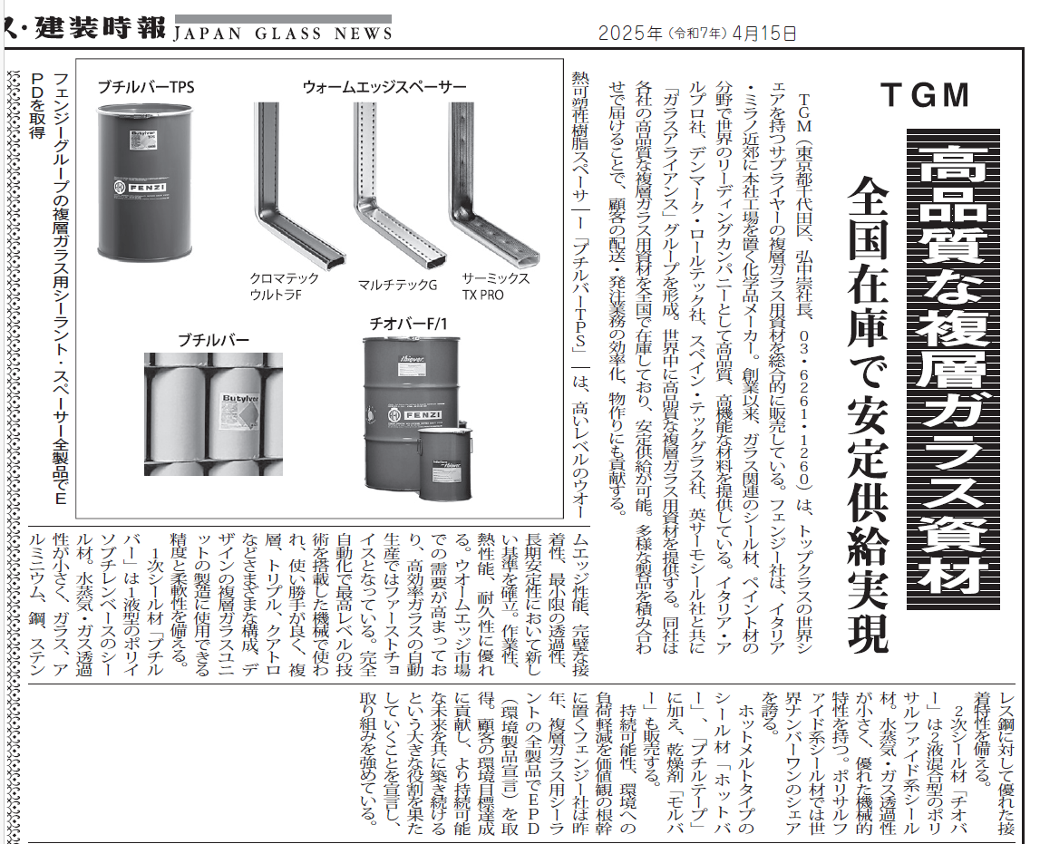 TGM(東京都千代田区、弘中崇社長、03・6261・1260)は、トップクラスの世界シェアを持つサプライヤーの複層ガラス用資材を総合的に販売している。フェンジー社は、イタリア・ミラノ近郊に本社工場を置く化学品メーカー。創業以来、ガラス関連のシール材、ペイント材の分野で世界のリーディングカンパニーとして高品質、高機能な材料を提供している。イタリア・アルプロ社、デンマーク・ロールテック社、スペイン・テックグラス社、英サーモシール社と共に「ガラスアライアンス」グループを形成。世界中に高品質な複層ガラス用資材を提供する。同社は各社の高品質な複層ガラス用資材を全国で在庫しており、安定供給が可能。多様な製品を積み合わせで届けることで、顧客の配送・発注業務の効率化、物作りにも貢献する。