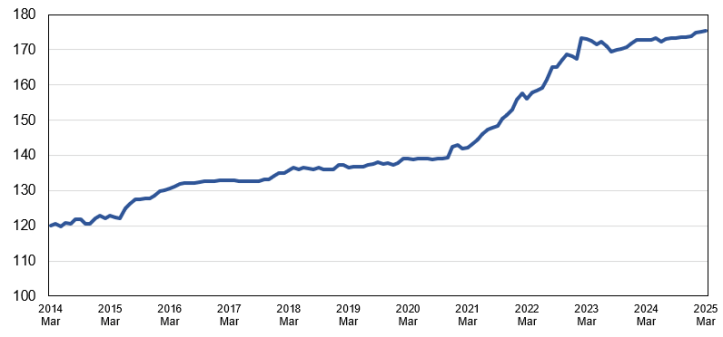 2025年4月14日に米国労働統計局が発表した生産者物価指数(品目別情報)の速報値によれば、2025年03月度の板ガラスの生産者物価指数は175.334であり、先月比+0.744(+0.087%)、前年同月比で+2.424(+1.402%)となりました。