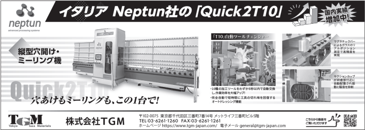 NC制御式マシニングセンター「クイックツー」シリーズ」は、ネプチューン社が培った経験と新鋭のシステムを融合させ、高品質と長寿命化を実現。「クイックドリル」シリーズと同様に最大200×300㍉のヒンジ用切削加工、切り欠き加工が可能。加工可能な最大ガラスサイズは、ラインアップによって高さ2800×幅4500㍉、厚さ5~12㍉に対応。加工位置の精度はプラスマイナス0・15㍉。