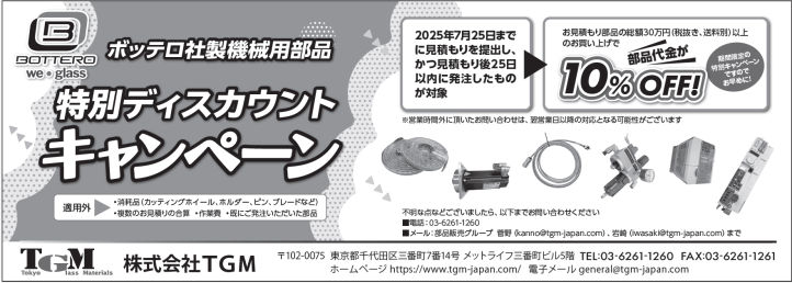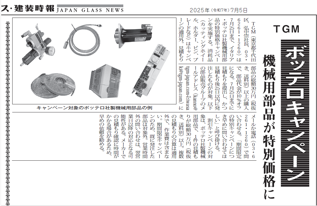 TGM(東京都千代田区、弘中崇社長、03・6261・1260)は7月25日まで、イタリア・ボッテロ社製機械用部品の特別価格キャンペーンを実施する。