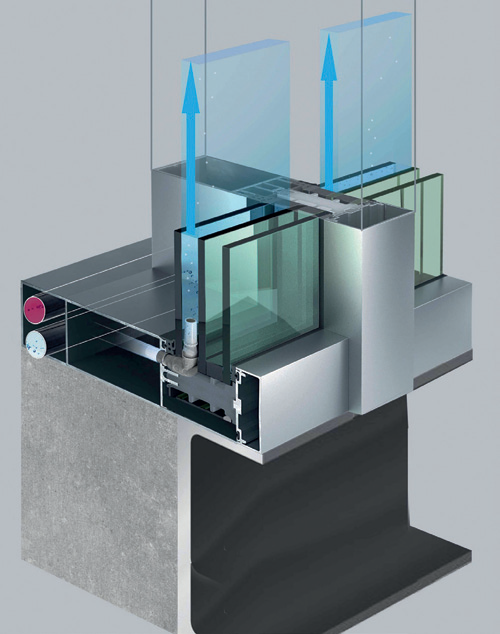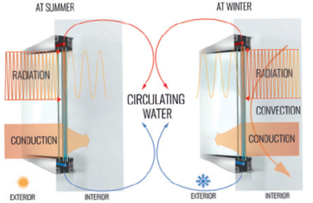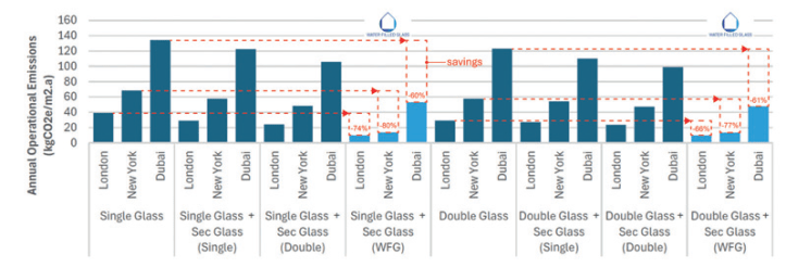 さらに、各ガラスユニットの水は熱交換器へと循環し、熱エネルギーを再利用できるため、快適性の向上とシステム全体の効率化にも貢献します。従来の複層ガラスと比較して、WFGは最大72%、Low-Eコーティングを施したトリプルガラスと比較しても61%のエネルギー消費を削減できることが確認されています。