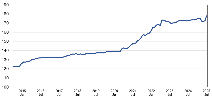 2025年8月14日(現地時間)に米国労働統計局が発表した生産者物価指数(品目別情報)の 速報値によれば、2025年7月度の板ガラスの生産者物価指数は177.884であり、先月比+5.313(+3.079%)、前年同月比で+4.802(+2.774%)と なりました。