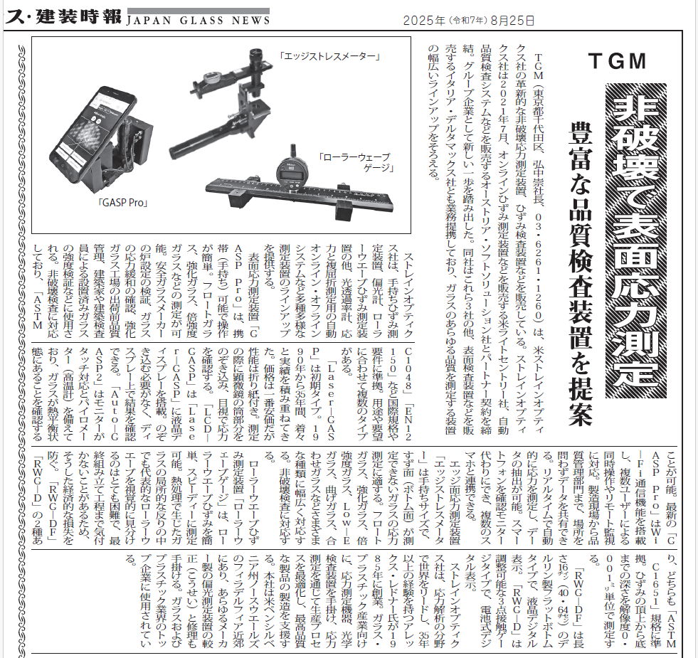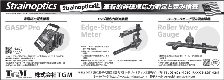 TGM(東京都千代田区、弘中崇社長、03・6261・1260)は、米ストレインオプティクス社の革新的な非破壊応力測定装置、ひずみ検査装置などを販売している。ストレインオプティクス社は2021年7月、オンラインひずみ測定装置などを販売する米ライトセントリー社、自動品質検査システムなどを販売するオーストリア・ソフトソリューション社とパートナー契約を締結。グループ企業として新しい一歩を踏み出した。同社はこれら3社の他、表面検査装置などを販売するイタリア・デルタマックス社とも業務提携しており、ガラスのあらゆる品質を測定する装置の幅広いラインアップをそろえる。