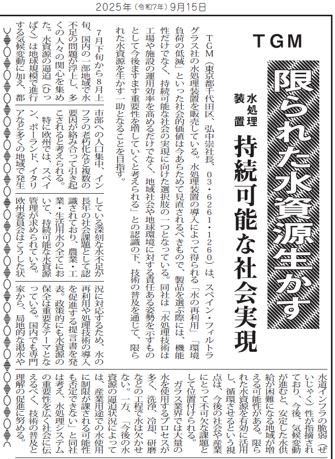 TGM(東京都千代田区、弘中崇社長、03・6261・1260)は、スペイン・フィルトラグラス社の水処理装置を販売している。水処理装置の導入によって得られる「水の再利用」「環境負荷の低減」といった社会的価値は今あらためて見直されるべきもので、製品を選ぶ際には、機能性だけでなく、持続可能な社会の実現に向けた選択肢の一つとなっている。同社は「水処理技術は工場や施設の運用効率を高めるだけでなく、地域社会や地球環境に対する責任ある姿勢を示すものとして今後ますます重要性を増していくと考えられる」との認識の下、技術の普及を通じて、限られた水資源を生かす一助となることを目指す。