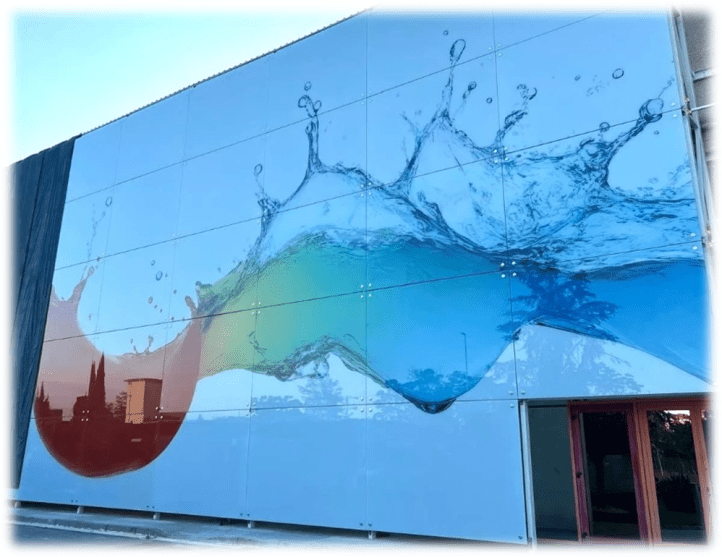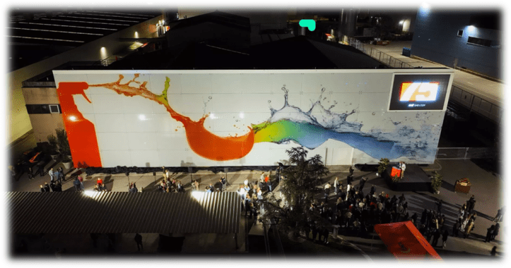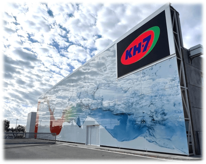 施設の正面には、IDSIFラインによって印刷された大型ガラススクリーンが設置されています。Lloreda社のマーケティングチームが手掛けた印象的なデザインは、同社の主力製品KH7への敬意と感謝の気持ちを込めたものです。鮮やかな赤・青・オレンジが白くプリントされた超高透過ガラスに融合した、洗練された色彩表現が施されています。
