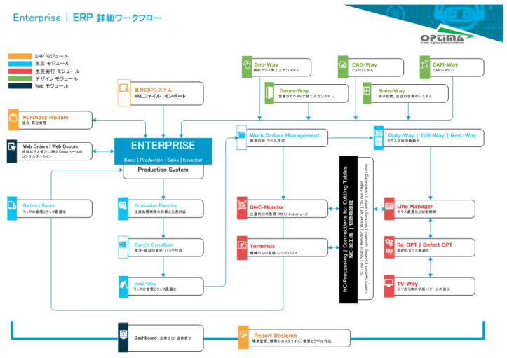 主力製品である Opty-Way は、ガラスの取り合わせ最適化ツールとして広く採用されていますが、近年は Opty-Way Enterprise の導入が急速に拡大しています。Opty-Way Enterprise は、切断工程だけでなく、強化ガラスや合わせガラス、スクリーン印刷、研磨、面取り、穴あけなど、多様な加工装置の運用を統合管理することが可能で、製造の自動化と効率化、さらには製造品質の向上に貢献します。