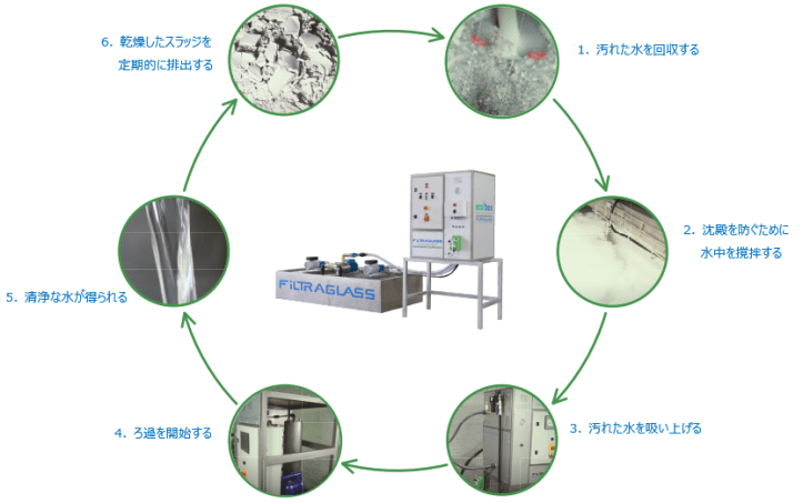 同社のシステムは、粉塵や微細ガラス片を効率的に分離・除去し、再利用可能な清浄水として循環させることが可能です。これにより、加工現場における水使用量の削減、排水コストの低減、機械寿命の延長に大きく貢献します。